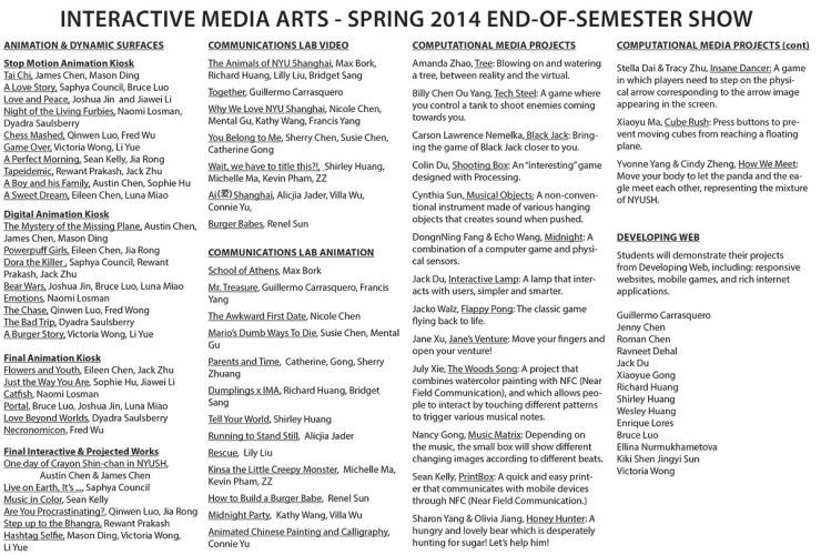 NYUSH – Interactive Media Arts (IMA) Spring Show Program