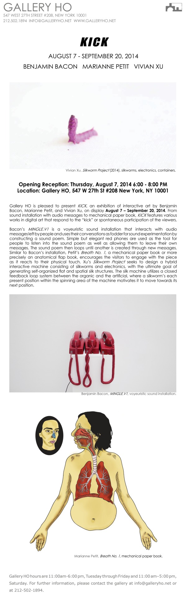 New York City. Kick: Benjamin Bacon, Marianne Petit, Vivian Xu, Opening Reception: Thursday August 7th, 6-8 pm, Gallery HO, 547 West 27th Street, Room 208. August 7th – September 20, 2014.