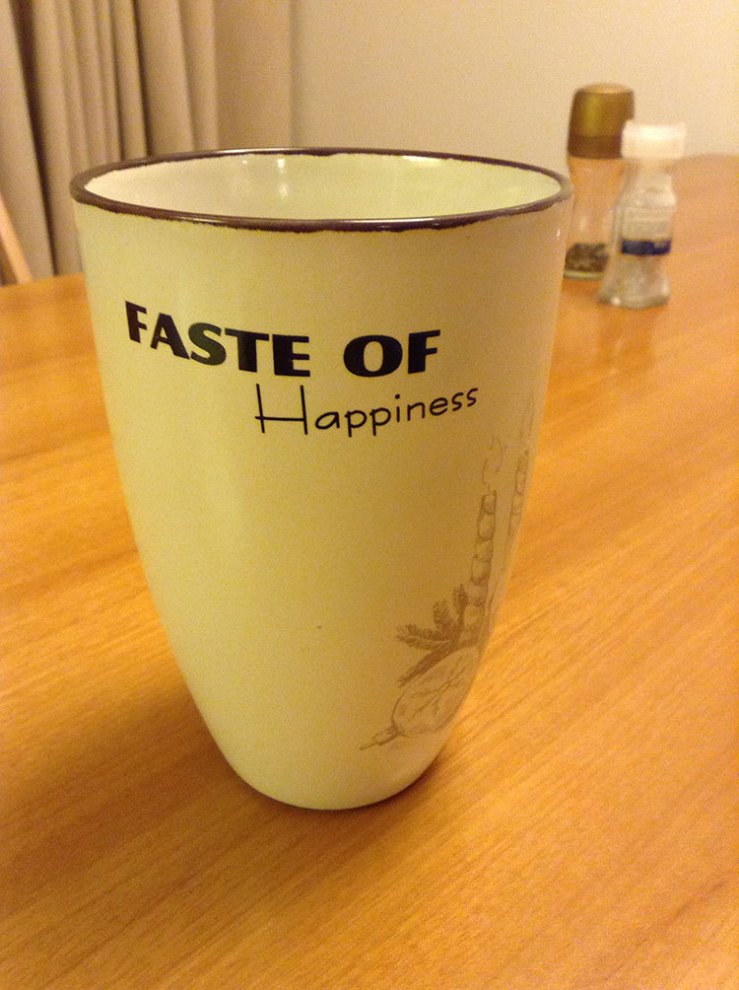 Shanghai, China. “Faste of Happiness”. These mugs were on sale at the Carrefour. Hundreds of them in many colors selling fast because they were so cheap. They have Christmas decorations on them. We think that someone made a mistake and they were supposed to say “Feast of Happiness.” I regret not buying more.